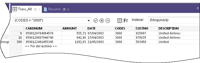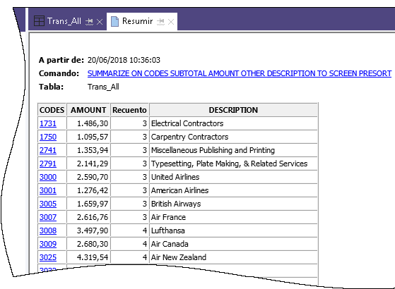 SUMMARIZE ON CODES SUBTOTAL AMOUNT OTHER DESCRIPTION TO "Trans_todas_agrupadas_s.FIL" OPEN PRESORT STATISTICS