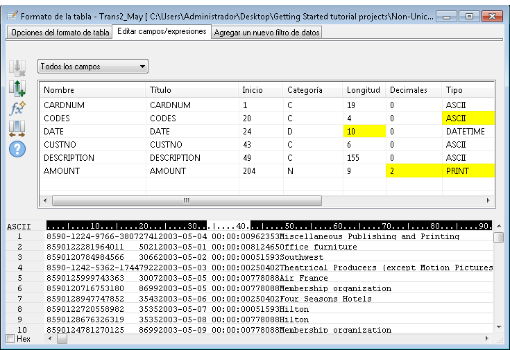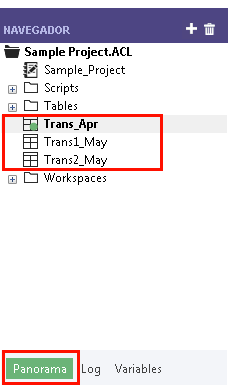 IMPORT EXCEL TO Trans2_May_s "C:\Usuarios\nombre_de_cuenta_de_usuario\Documentos\ACL Data\Sample Data Files\Trans2_May_s.fil" FROM "Trans_May.xls" TABLE "Trans2_May$" KEEPTITLEFIELD "CARDNUM" C WID 19 AS "" FIELD "CODES" N WID 4 DEC 0 AS "" FIELD "DATE" D WID 19 PIC "AAAA-MM-DD hh:mm:ss" AS "" FIELD "CUSTNO" C WID 6 AS "" FIELD "DESCRIPTION" C WID 155 AS "" FIELD "AMOUNT" C WID 9 AS ""