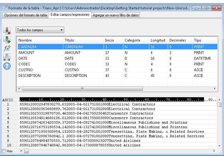 IMPORT EXCEL TO Trans_Apr_s "C:\Usuarios\nombre_de_cuenta_de_usuario\Documentos\ACL Data\Sample Data Files\Trans_Apr_s.fil" FROM "Trans_April.xls" TABLE "Trans_Apr$" KEEPTITLE FIELD "CARDNUM" N WID 16 DEC 0 AS "" FIELD "AMOUNT" N WID 6 DEC 2 AS "" FIELD "DATE" D WID 10 PIC "AAAA-MM-DD" AS "" FIELD "CODES" N WID 4 DEC 0 AS "" FIELD "CUSTNO" C WID 6 AS "" FIELD "DESCRIPTION" C WID 45 AS ""