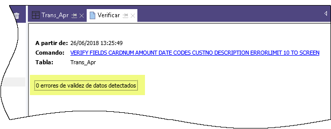 VERIFY FIELDS CARDNUM CODES DATE CUSTNO DESCRIPTION AMOUNT ERRORLIMIT 10