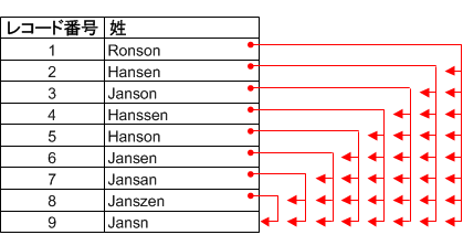 あいまい重複操作では、検査フィールドを下方(後方)へ順に移動するので、グループ所有者は、フィールド内でそのグループ所有者の下(後続)に現れるあいまい重複のみと関連付けられます。グループ所有者の前に現れるあいまい重複とは関連付けられません。 グループ所有者は、既にその上で現れる 1 つ以上のグループのメンバーである可能性があります。ただし、その逆はありません。上方(前方)にあるグループの所有者は、後続グループのメンバーにはなりません。値がグループの所有者になった場合、その値はそれ以降のグループに現れることはありません。 上記の例では、グループ 6 の所有者である "Jansen" は、前の 2 つのグループのメンバーです。しかし、それら 2 つののグループの所有者("Hansen" と "Janson")は、"Jansen" のあいまい重複であるにもかかわらず、グループ 6 のメンバーではありません。 |