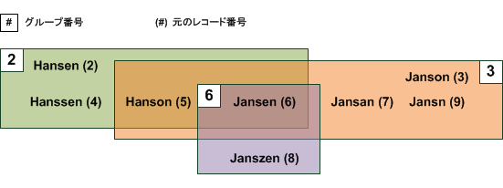 上記の例では、"Hanson" と "Jansen" はグループ 2 とグループ 3 の両方に出現します。この場合、相違の度合いが、2 つの値間ではなく、それぞれのグループの所有者から測定されるので、複数のグループへ一緒に現れることになります。 |