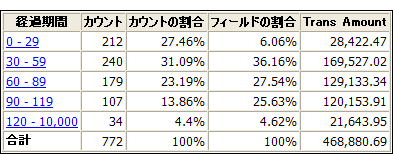 たとえば、売掛金テーブルの年齢調べを請求日フィールドに基づいて行うことができます。レコードを 30 日の期間、つまり、締切日から 29 日前まで、30 日前から 59 日前まで、というようにグループ化し、各期間の未払い請求書の総数を調べます。