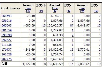 | 2 つ以上の文字または数値フィールドの値の等しい組み合わせに基づいてレコードをグループ化し、そのグループを行と列のグリッドに表示する | Cust Number フィールド(行)と Type フィールド(列)の交差位置 |