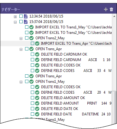 IMPORT EXCEL TO Trans2_May_s "C:\Users\user_account_name\Documents\ACL Data\Sample Data Files\Trans2_May_s.fil" FROM "Trans_May.xls" TABLE "Trans2_May$" KEEPTITLE FIELD "CARDNUM" C WID 19 AS "" FIELD "CODES" N WID 4 DEC 0 AS "" FIELD "DATE" D WID 19 PIC "YYYY-MM-DD hh:mm:ss" AS "" FIELD "CUSTNO" C WID 6 AS "" FIELD "DESCRIPTION" C WID 155 AS "" FIELD "AMOUNT" C WID 9 AS ""