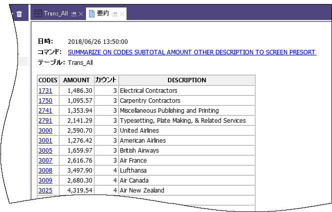 - 各マーチャント カテゴリの法人クレジットカード取引のカウントおよび合計金額を特定する