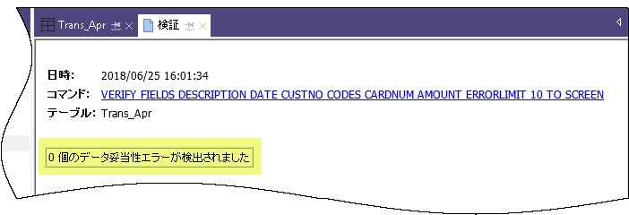 IF WRITE1=0 DIALOG (DIALOG TITLE "ユーザー ダイアログ" WIDTH 490 HEIGHT 100 ) (BUTTONSET TITLE "&OK;&Cancel" AT 360 12 DEFAULT 1 ) (TEXT TITLE "Trans2_May_s テーブル: 0 data validity errors detected" AT 12 28 )