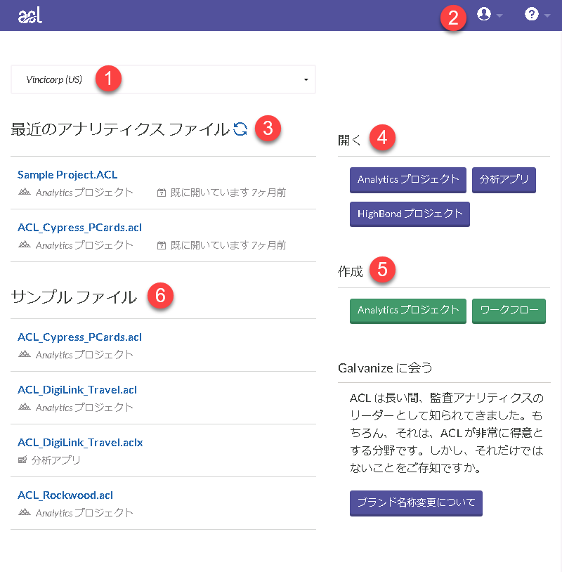 | 6 | サンプル ファイル | さまざまなサンプル データを含む、事前に作成済みの Analytics プロジェクトを開きます。 |