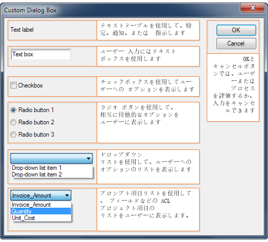 カスタム ダイアログボックスを使用して、次のようなさまざまな機能を実行します。