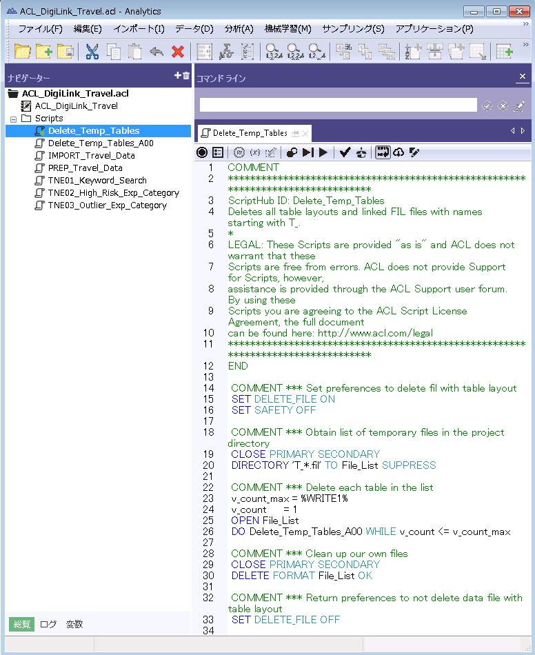 | コマンド ログのエントリを選択して、自動的に ACL Script を作成します。プロジェクトで実行された全てのコマンドのレコードは保持されます。 | |