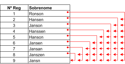 Como a operação de duplicidades parciais move o campo de teste sequencialmente para baixo, os proprietários de grupo são associados com apenas essas duplicidades parciais que aparecem abaixo deles no campo, não com outras que apareçam acima. Em muitos casos, um proprietário de grupo é membro de um ou mais grupos que aparecem acima dele. No entanto, o inverso não é verdadeiro. Os proprietários de grupo acima não são membros do grupo subsequente. Uma vez que um valor se torna o proprietário de grupo, ele nunca aparece em um grupo subsequente. No exemplo acima, o proprietário do Grupo 6, "Jansen", é membro de dois grupos anteriores, mas os proprietários desses grupos ("Hansen" e "Janson"), mesmo sendo duplicidades parciais de "Jansen", não são membros do Grupo 6. |