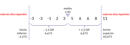 Os valores superiores a +2,5 desvios padrão da média, ou inferiores a -2,5 desvios padrão da média são incluídos como valores discrepantes nos resultados de saída.