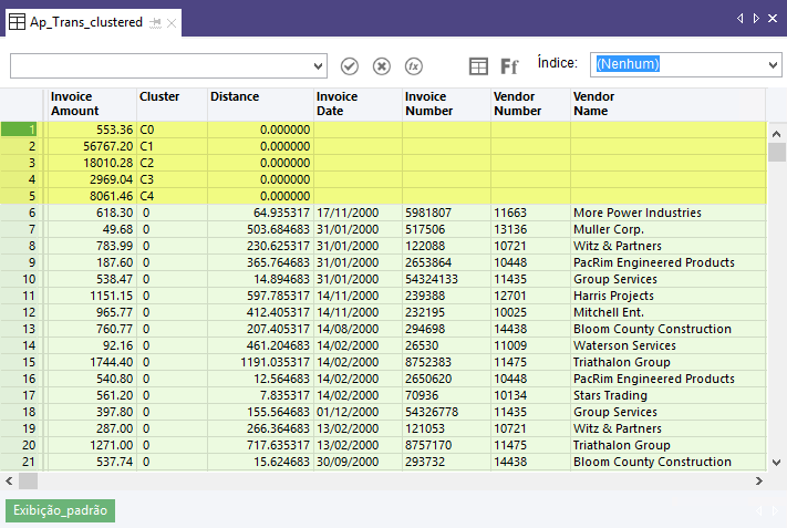 Por trás dos campos gerados pelo sistema, estão os campos de dados de origem agrupados em clusters a partir do cluster 0. O valor no campo Distância é a distância entre o valor real da fatura e o valor de centroide calculado para esse cluster. Por exemplo, no registro 6, o valor da fatura de 618,30 menos a distância de 64,935317 equivale ao valor de centroide de 553,36.
