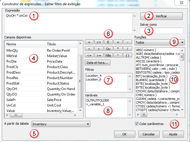 | 6 | Botões Operador e Seletor de Data e hora | Botões para adicionar operadores, ou datas, datahoras ou horas à caixa de texto Expressão |