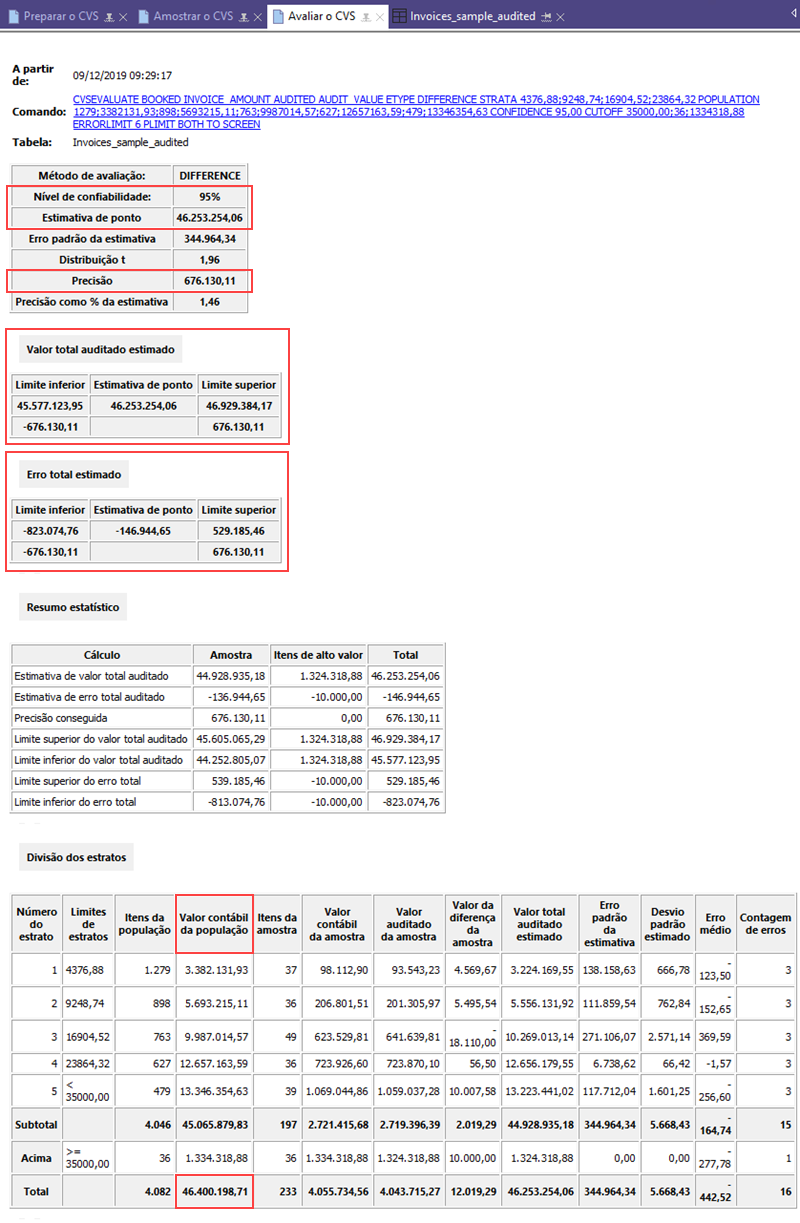 Nível de confiabilidade (%) Número de erros esperados Valor contábil Limites de precisão Limites de estratos População (contagem, valor) Limite de estrato de certeza superior (limite, contagem, valor) |