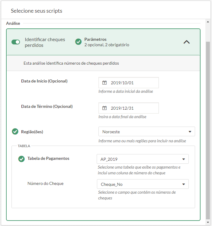 Cria um parâmetro de saída que especifica que o arquivo de resultados Cheques_Faltantes.xls está disponibilizado aos usuários no Robôs. Os resultados de saída de scripts, mesmo quando existentes, não são automaticamente disponibilizados. A disponibilidade deve ser especificada no cabeçalho da análise. |