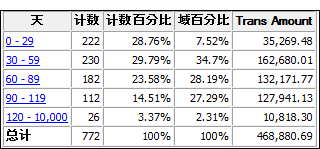 例如,您可以根据发票日期域对应收帐款表进行帐龄分析,以便将记录分组到 30 日期限中 — 从截止日期到 29 天前,从 30 天前到 59 天前,等等 — 并且查找每个期限的未付发票总数。