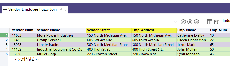 您使用每个表中的地址域作为公共键(Vendor_Street 和 Emp_Address),将 Vendor 主表与 Employee 表相联接。但是,键域中地址数据的形式略有不同,因此您使用模糊联接而不是常规联接。
