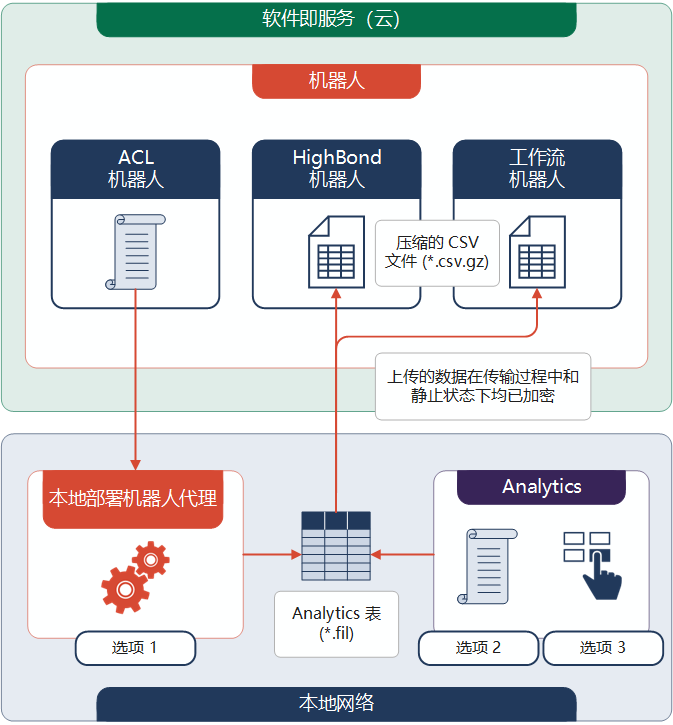 对于使用 ACL 脚本和本地部署的机器人代理的组织,此功能让您能够构建集成式 ACLScript-Python/HCL 数据自动化工作流,将数据从本地网络移动到基于云的机器人实例。