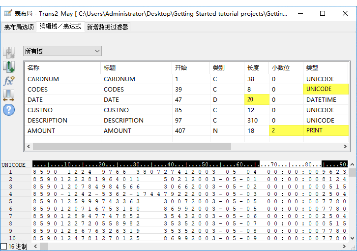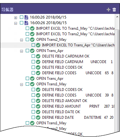 IMPORT EXCEL TO Trans2_May_s "C:\Users\用户账户名称\Documents\ACL Data\Sample Data Files\Trans2_May_s.fil" FROM "Trans_May.xls" TABLE "Trans2_May$" KEEPTITLE FIELD "CARDNUM" C WID 19 AS "" FIELD "CODES" N WID 4 DEC 0 AS "" FIELD "DATE" D WID 19 PIC "YYYY-MM-DD hh:mm:ss" AS "" FIELD "CUSTNO" C WID 6 AS "" FIELD "DESCRIPTION" C WID 155 AS "" FIELD "AMOUNT" C WID 9 AS ""