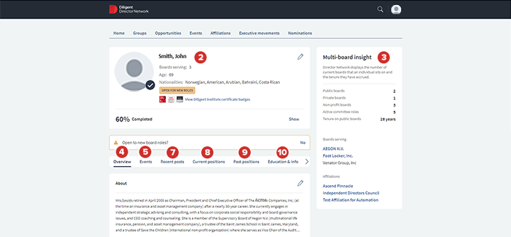 The Multi-Board Insight section shows the number of boards and the boards on which the individual sits, how many committees they sit on, the length of their tenure, and any associations they have with our diversity affiliation partners.
