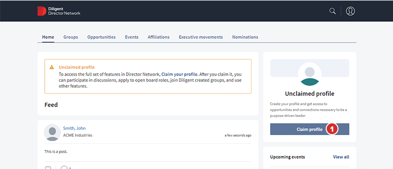 Select Finish to complete creating your profile. After you create your profile, the Profile section on the Home Feed updates to state that your Claim is pending. Diligent will contact you to confirm your request. After Diligent adds your profile, it will automatically claim it for you, and update the Profile section with your new profile.