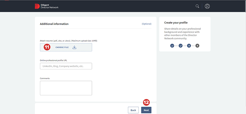 (Optional) In the Additional Information section, you can upload your resume, enter the web address to your online professional profile, and enter any additional comments that you want to make.