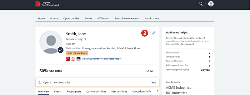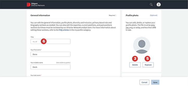 When you're done, select Save. Any changes that you've made to the General Information, Profile Photo, Diversity and Inclusion, Primary Board Role and Biography sections are immediately applied and visible to all Director Network users.