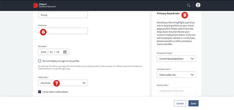 The Diversity and Inclusion section appears only if you select American as your nationality in the General Information section. If your nationality is not American but you would like to disclose your diversity information so that you appear in the diverse candidate lists, email directornetworksupport@diligent.com.
