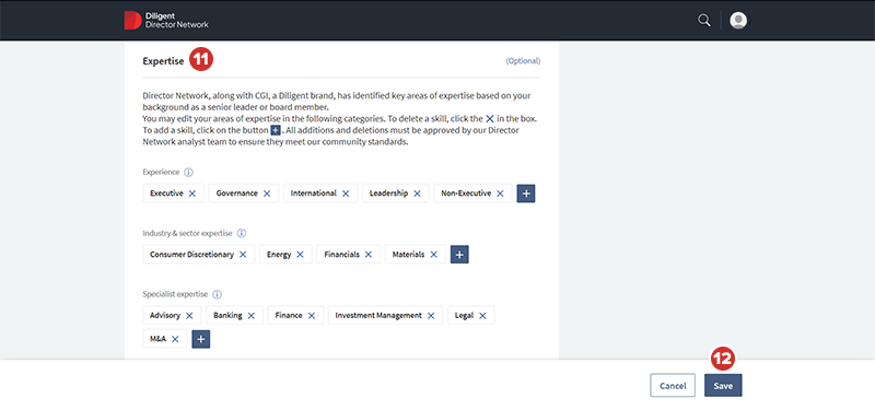 (Optional) You can edit your experience, industry and sector expertise, specialist expertise, and committee expertise in the Expertise section. For further information about editing your expertise, go to Editing your skills and expertise.