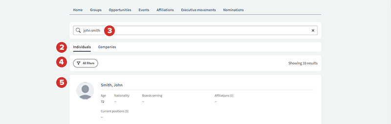 To search for an individual or company, select the Individual or Companies tab. You can search using the search field and filters with the Individuals tab while you can only search using the search field with the Companies tab.