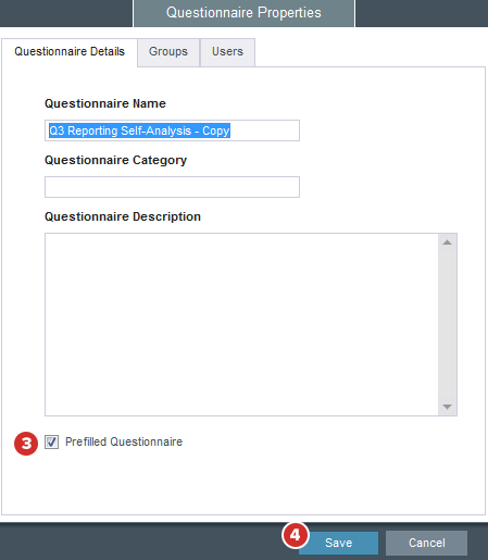 The Prefilled Questionnaire checkbox will indicate if the questionnaire is a prefilled questionnaire or not. If it is not, check this box to make it one.