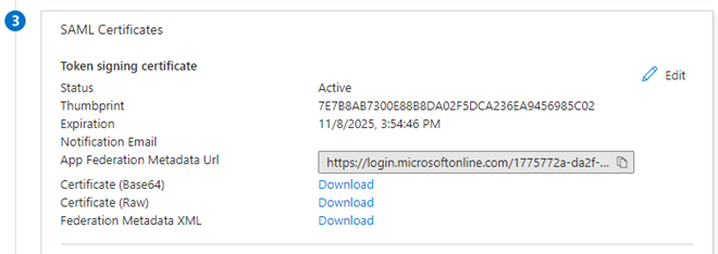 From the SAML Certificates section, select Download next to the "Federation Metadata XML" option.
