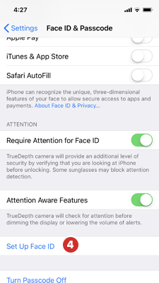 Desplácese hacia abajo y seleccione Configurar Face ID, luego siga las instrucciones en pantalla para configurar Face ID en su dispositivo.