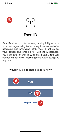 Si pertenece a varios sitios de Messenger, Face ID debe ser habilitado por Diligent para cada sitio, de modo que lo tenga disponible como una opción.