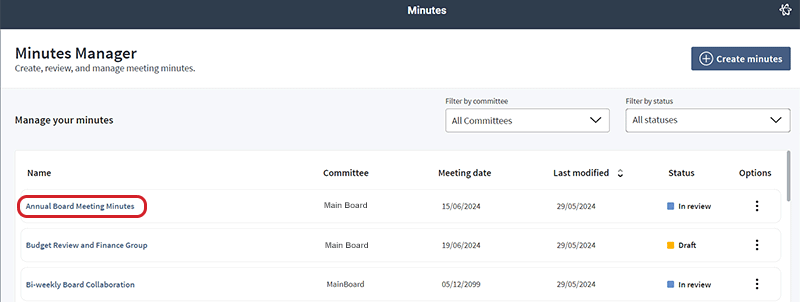 Para abrir un documento de minutas desde el administrador de minutas, seleccione el nombre del documento. Será llevado al documento de minutas.