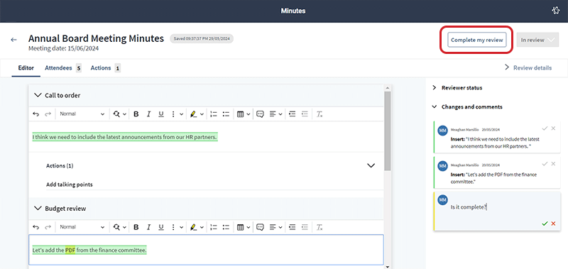 Puede agregar comentarios y sugerir modificaciones cuando lo agreguen como revisor a un documento de minutas en borrador. Este artículo explica cómo los revisores pueden revisar el borrador.