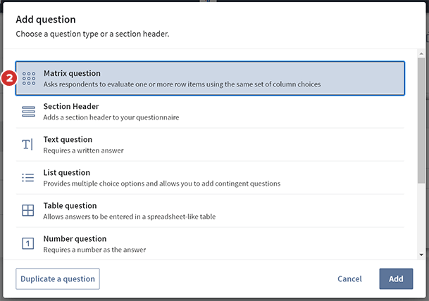 Seleccione Pregunta matriz en la lista de opciones y luego seleccione “Agregar”.