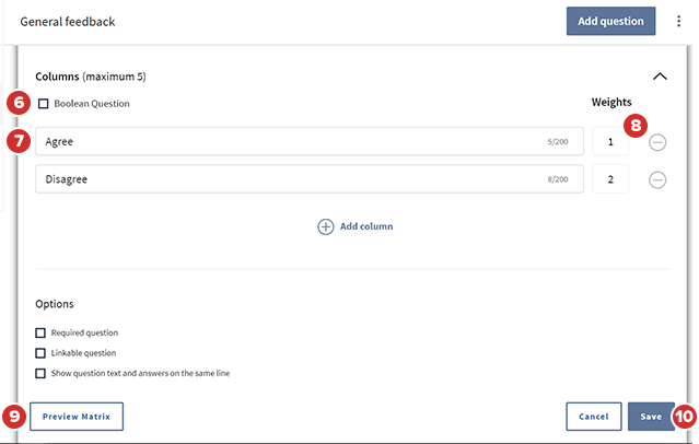 Ingrese el texto para las Columnas. Las etiquetas de las columnas son las opciones que desea que los encuestados seleccionen. Aparecen en la parte superior de la tabla Matriz.