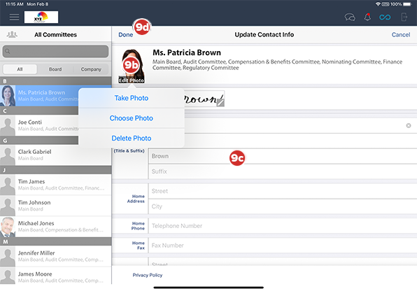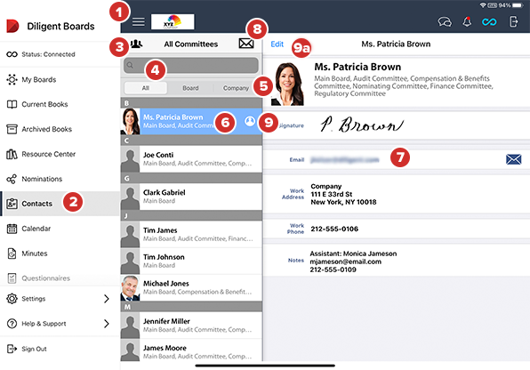 Para enviar mensajes por correo electrónico a todos los miembros de la junta directiva asociados con un grupo de reunión específico, primero seleccione la junta directiva o el comité en el filtro de grupos de reunión (paso 3) y luego toque el icono correo electrónico, que se encuentra en la parte superior del panel de contactos.