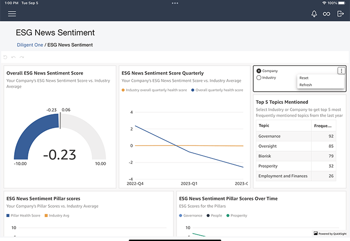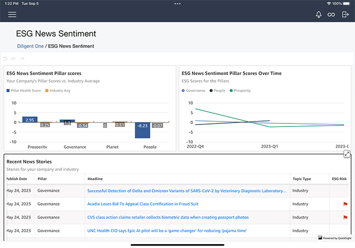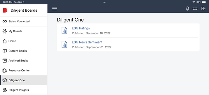 En el centro de Diligent One, seleccione Percepción en las noticias en cuanto a ESG para abrir el informe.