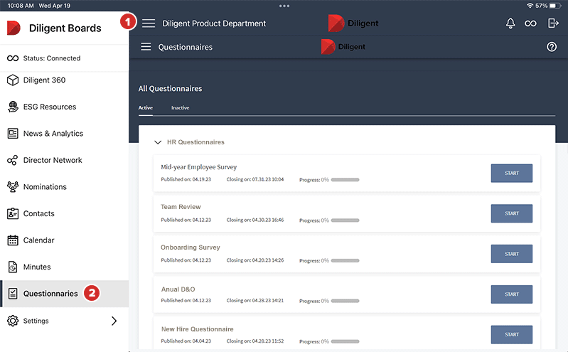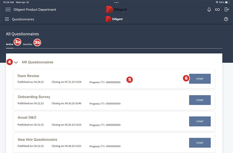 Visualice y administre sus respuestas a los cuestionarios o las encuestas que publica su organización. El progreso se guarda en tiempo real para que pueda volver al cuestionario y enviar su respuesta en cualquier momento.
