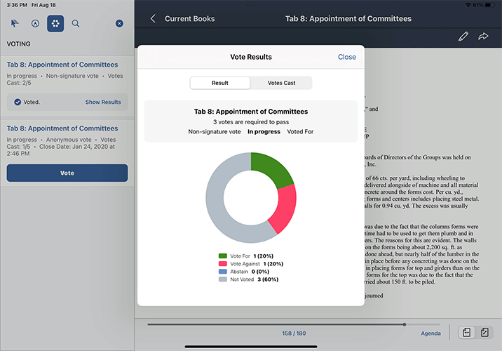 La ventana de votación incluye el título del documento de votación, el tipo de voto y el estado de la votación. Use el estado de la votación para identificar si la votación aún está en curso o si ya concluyó.