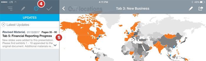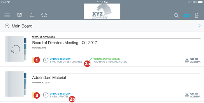 El icono Historial de actualizaciones aparecerá en la sincronización si la actualización del libro incluye cambios en los documentos que el administrador de la junta directiva ha decidido publicar.
