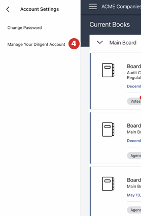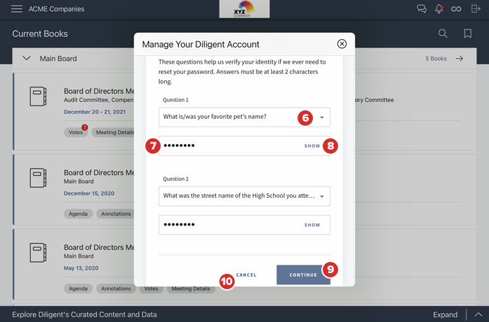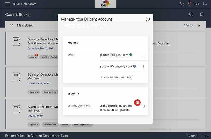 Seleccione Gestione su cuenta de Diligent. Aparecerá la ventana para que administre sus preguntas de seguridad.