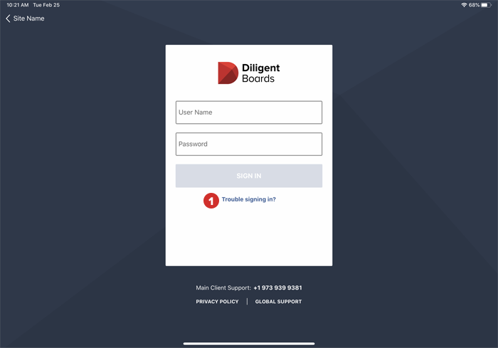 Seleccione ¿Problemas para iniciar sesión? en la pantalla de inicio de sesión de Diligent Boards.