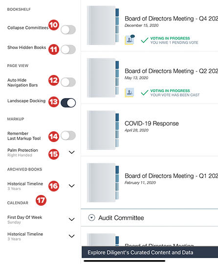 Contraer comités puede reducir el desplazamiento en la vista de librero de los libros actuales y archivados. Al habilitarse, el librero mostrará solo títulos de la junta directiva y los comités, con la lista de libros contraída dentro de cada título.