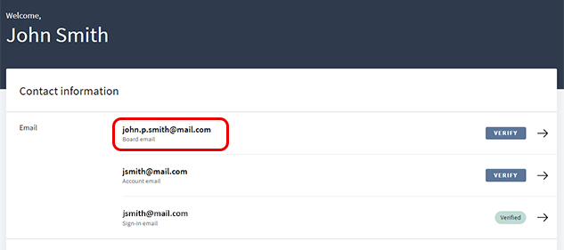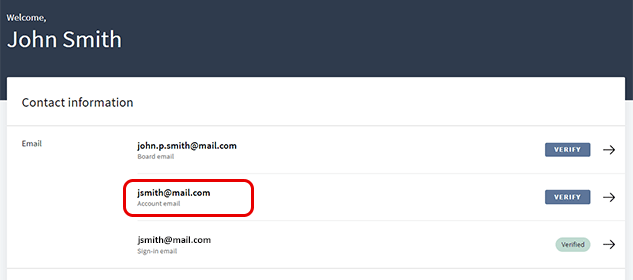 El correo electrónico de la cuenta se emplea para recibir comunicaciones que inciden en el acceso de un usuario a su cuenta. Por ejemplo, el proceso de recuperación de autoservicio usa este correo electrónico para enviar códigos de verificación para el restablecimiento de la contraseña o para recuperar nombres de sitios o correos electrónicos de inicio de sesión. El correo electrónico de la cuenta no es específico de la junta directiva o la organización y se comparte en todos los sitios a los que tiene acceso un usuario. Cada usuario puede tener más de una cuenta de correo electrónico.