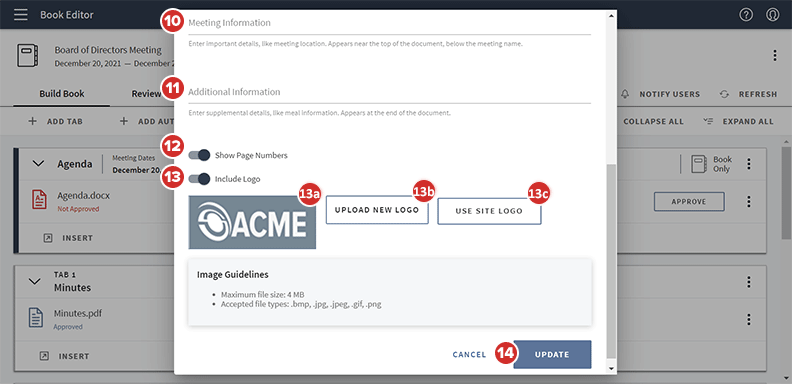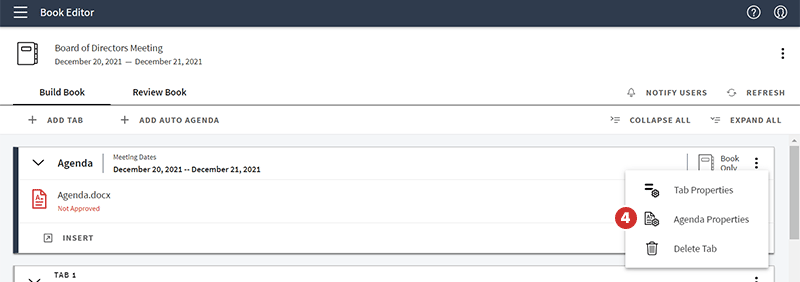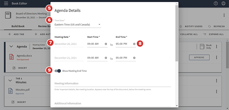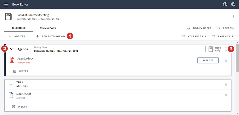 Con el generador de agendas, puede usar la estructura de su libro para configurar una agenda completamente diagramada que se agregue directamente a su libro de junta directiva. En esta tema, aprenderá a usar el generador de agendas para agregar una agenda a su libro y a agregar y editar información sobre la reunión para que aparezca en la agenda.