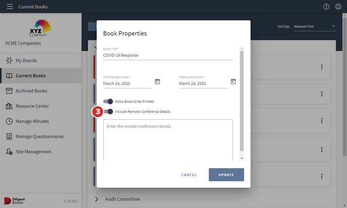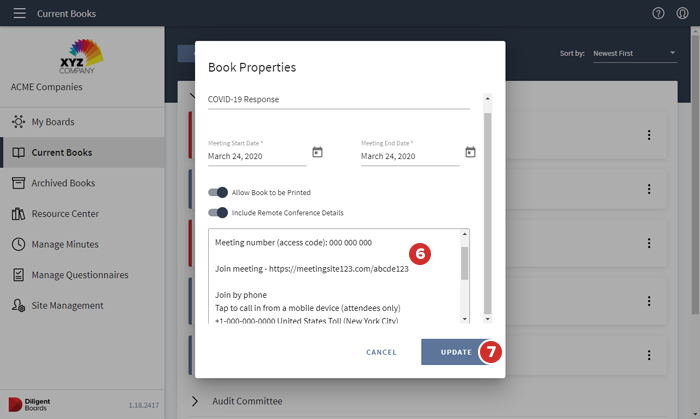 Regrese a Diligent Boards, y en el campo "Ingresar los detalles de la conferencia a distancia" pegue los detalles de la reunión que copió.